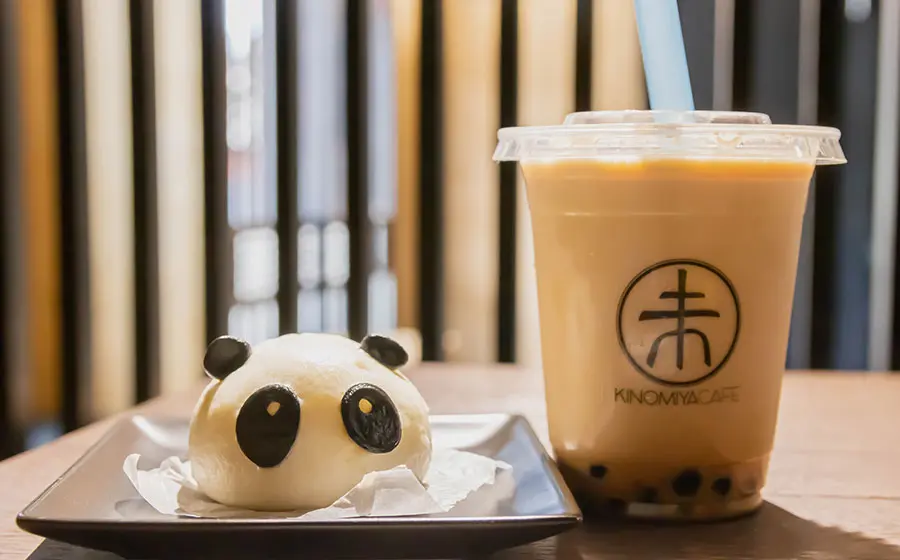 来宮神社の御神木をイメージされたという店内でいただいたのはタピオカミルクティーとパンダあんまん。