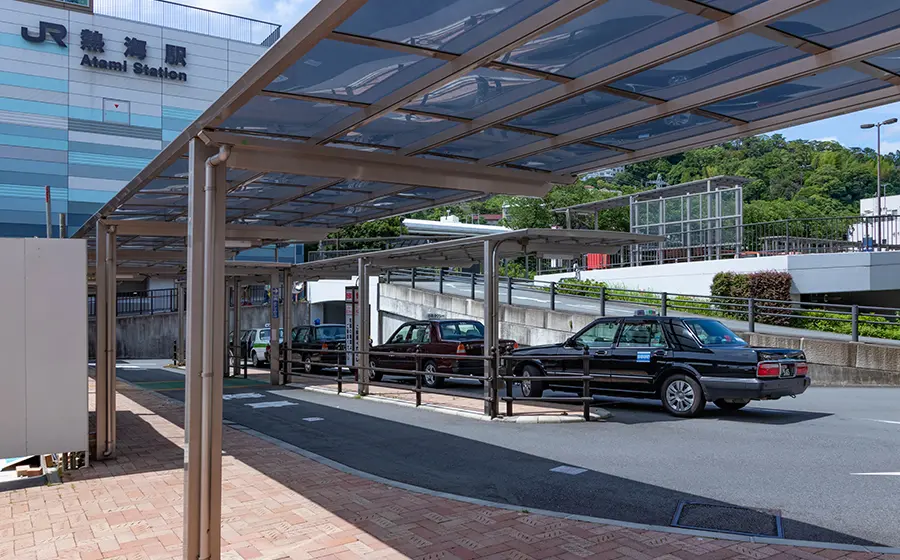 駅から観光施設やホテル旅館への利用であれば熱海駅改札を出て左前方。旅の疲れを癒せる足湯「家康の湯」のすぐ横にタクシー乗り場があるのでそちらから利用できるのですが、街中から乗る場合はなかなか捕まりにくいと思います。