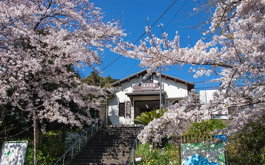 熱海の南側にある伊豆多賀温泉は静かな海の側でのんびりとした時間を過ごせることで人気の温泉地。そんな伊豆多賀温泉の入り口になるこの駅は、海(長浜海岸)を見下ろす山の中腹にあり、桜のシーズンにはソメイヨシノが楽しめます!